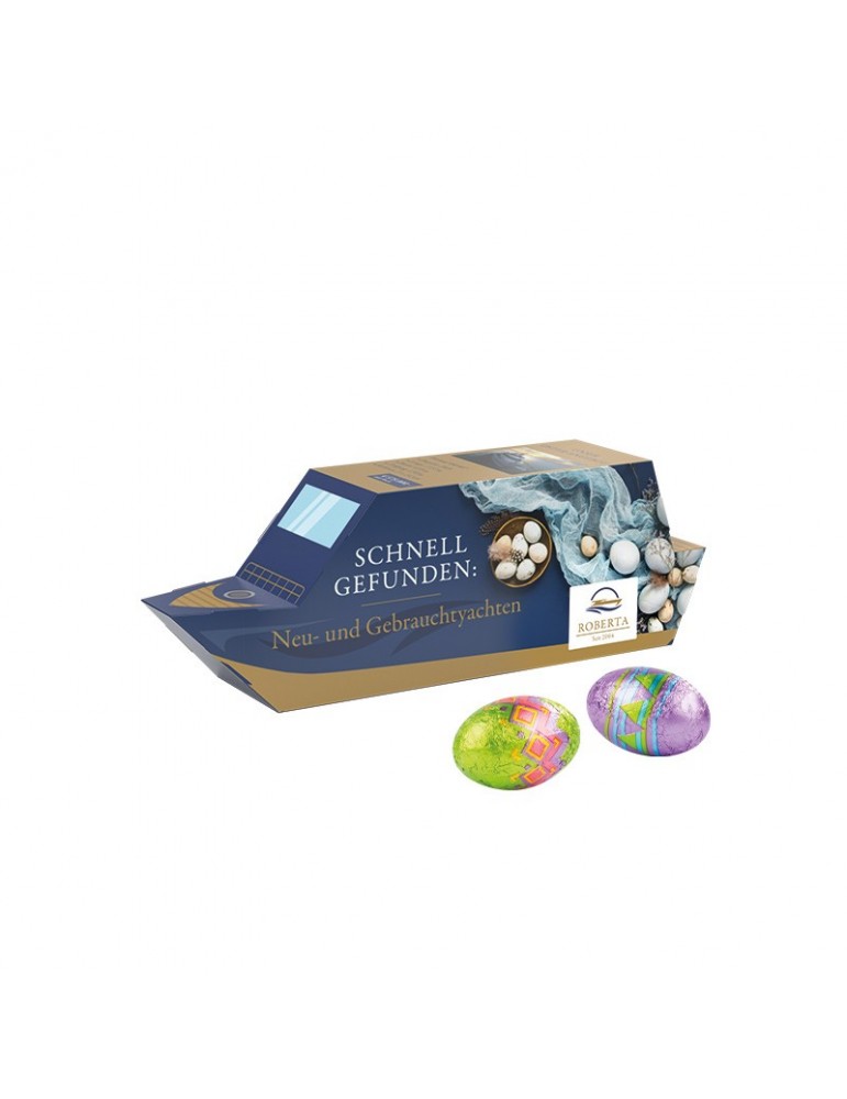 Schiff Verpackung aus weißem Karton, individuell bedruckt. Mit verschiedenen Füllvarianten
