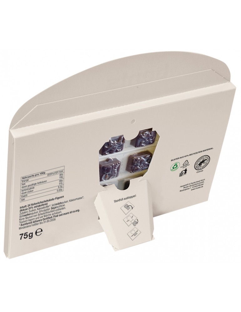 Tisch-Adventskalender im Kundendesign mit ausklappbarem stabilen Standfuß. Ausgestanztes Loch zum Aufhängen an der Wand.