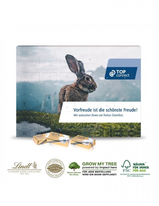 Ostern ist am 20. April Dieser Osterkalender der Spitzenklasse, gefüllt mit zartschmelzender Lindt Schokolade verspricht 20 exklusive Genussmomente. Ein hervorragendes Kunden- und Mitarbeitergeschenk.. Produktdetails: Schokoladen-Adventskalender in hochwertiger Vollkartonhülle im Querformat, mit praktischem Tischaufsteller zum Ausklappen.. Nachhaltigkeit: Für jede Bestellung mit uns wird ein Baum über GROW MY TREE gepflanzt. Wir verwenden FSC® zertifizierten Karton aus nachhaltiger Forstwirtschaft und anderen kontrollierten Quellen.