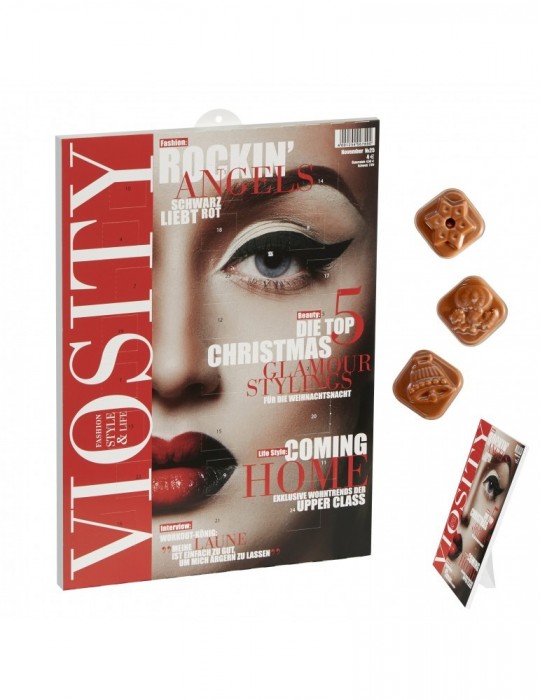 Wand-/Tisch-Adventskalender im Hoch- oder Querformat mit stabilem Tiefziehteil aus 100 % recycelbarem Mono-Material mit Recyclinganteil, 24 Türchen gefüllt mit Vollmilchschokolade, 3-fach verklebt. Mindestmenge je Motiv: 25.000 Stück. Vollmilchschokolade mit mindestens 35 % Kakao.