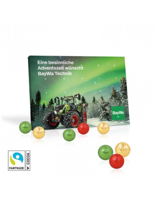 Individueller Firmen Adventskalender! Tisch-Adventskalender mit praktischem Aufsteller zum Ausklappen. Gefüllt mit leckeren Fairtrade® Schokoladenkugeln mit feiner Milchcremefüllung. Rundum individuell nach Ihren Vorlagen bedruckbar.