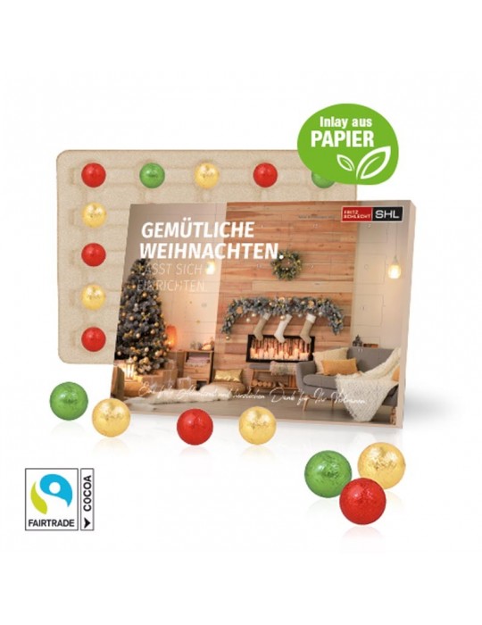 Individueller Firmen Adventskalender! Tisch-Adventskalender mit praktischem Aufsteller zum Ausklappen. Gefüllt mit leckeren Fairtrade® Schokoladenkugeln mit feiner Milchcremefüllung. Rundum individuell nach Ihren Vorlagen bedruckbar.