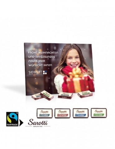 Der werbestarke Blickfang auf jedem Schreibtisch! Mit diesem hochwertigen Tisch-Adventskalender treffen Sie den Geschmack Ihrer Kunden und Kundinnen! Feinste Schweizer Schokolade von Sarotti in vier verschiedenen Geschmacksrichtungen sorgt für 24 Genussmomente. Die Schokolade ist Fairtrade®-zertifiziert.