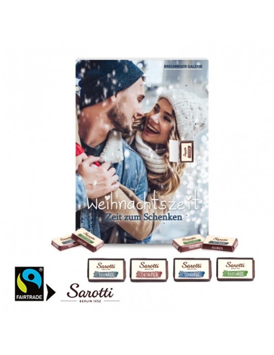 - 24 Stück (ca. 103 g) feinste Markenschokolade von Sarotti, Fairtrade®-zertifiziert, in vier ausgewählten Geschmacksrichtungen (Vollmilch, Gianduja, Haselnuss und Zartbitter gemischt).