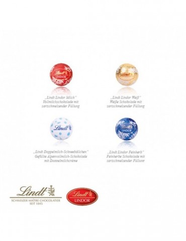 - 24 Stück Lindt Lindor „Minis“ (ca. 110 g) mit einer unendlich zartschmelzenden Füllung, in den Geschmacksrichtungen Lindt Lindor Vollmilch, weiße Schokolade, Doppelmilch und Feinherb