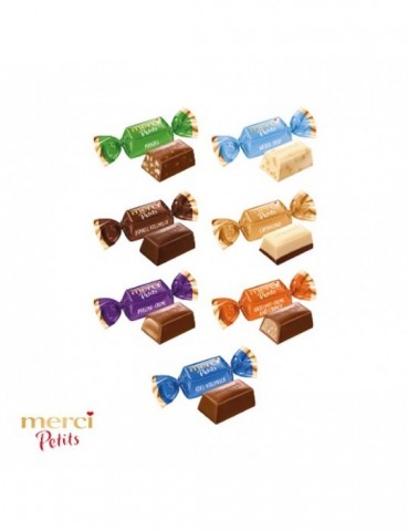 - 24 Stück (ca. 140 g) Schokoladenmischung von Merci. Geschmacksrichtungen: Edel-Vollmich, Mandel, Weisse Crisp, Dunkle Vollmilch, Cappuccino, Praline-Creme, Haselnuss-Creme und Crunch. Bunt gemischt