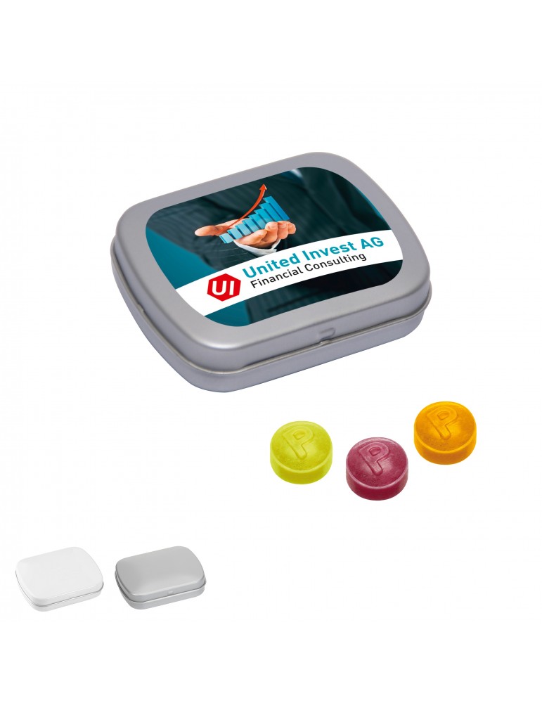 Metalldose weiß-glänzend, silberfarben-glänzend oder -matt, rechteckig mit Scharnierdeckel, wiederbefüllbar, mit Orginalitätsverschluss. Solange Vorrat reicht.