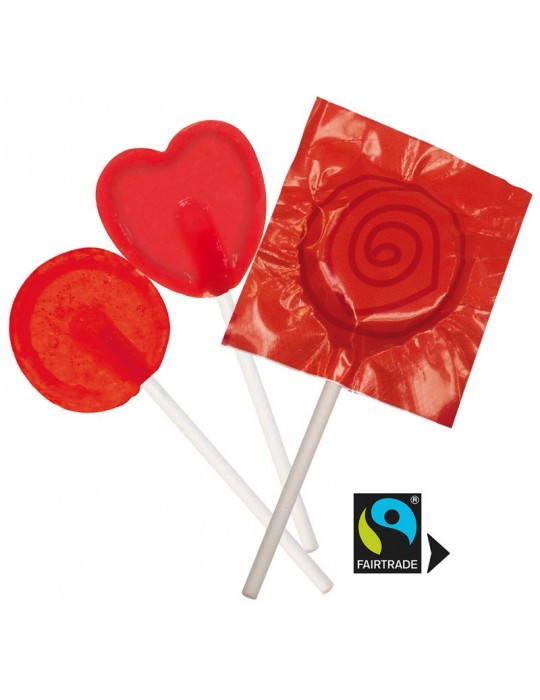 Runder oder herzförmiger Fairtrade-Lutscher in bedruckter weißen oder transparenten Folie. 1 Geschmackrichtung je 10.000 Stück. Falls Sie eine Mischung verschiedener Geschmackssorten wünschen (z. B. Apfel, Kirsche, Cola, Zitrone, Birne, Erdbeere, Blaubeere, Weintraube, Minze, Honig-Zitrone, Lakritzextrakt und grüner Tee), können Sie 1 Geschmack je 10.000 Lutscher bestimmen.
