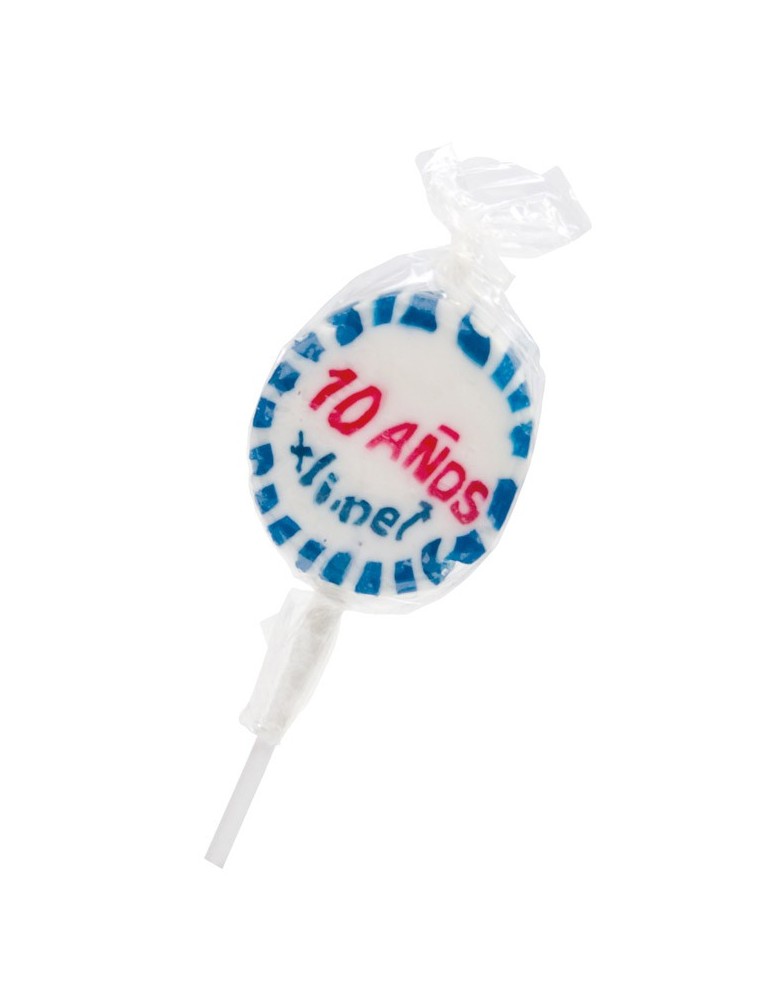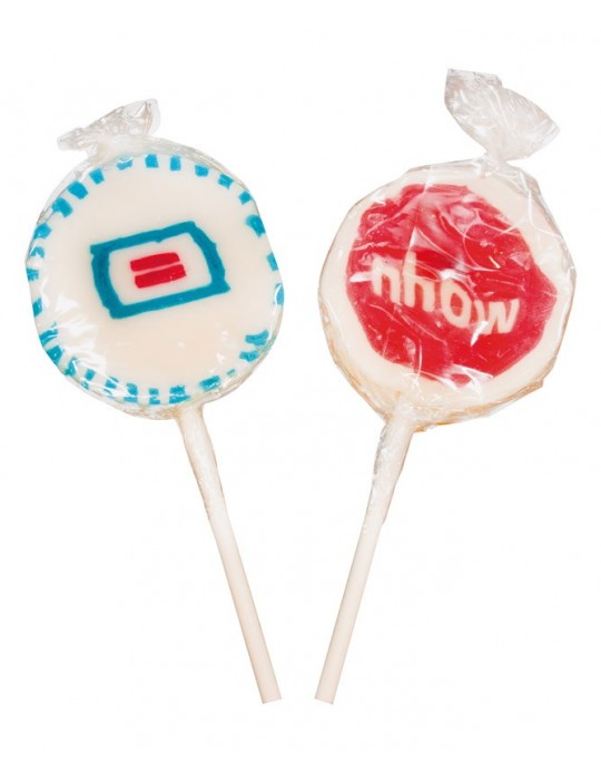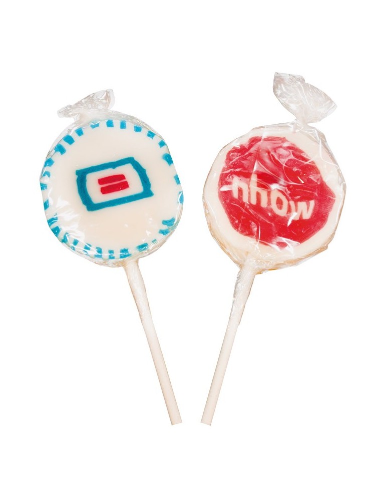 Lutscher mit eingelegtem, durchgehenden Text (Rückseite ist daher spiegelverkehrt), werden in Handarbeit nach alter Zuckerbäckertradition hergestellt. Jeder Lutscher ist in Klarsichtfolie gewickelt. Geschmacksrichtung: Standard Frucht. Andere Geschmacksrichtungen möglich.