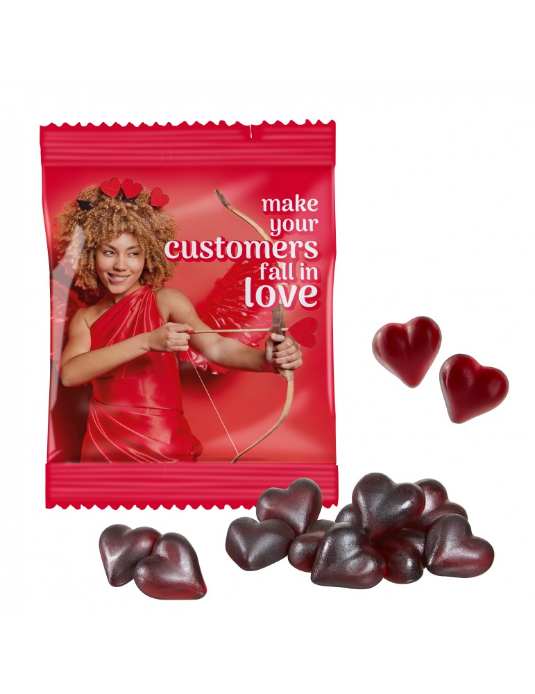 Cassis Fruchtsaft-Herzen mit 25 % Fruchtgehalt aus Fruchtsaftkonzentrat, Aroma und färbenden Lebensmittelkonzentraten, in glänzend- oder matt-kaschiertem transparentem alternativ weißem Werbetütchen verpackt.