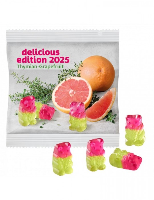 2-farbiges Fruchtgummi ohne Gelatine, mit spritzigem Grapefruit und herbem Thymian-Aroma, in transparentem alternativ weißem kompostierbarem Werbetütchen verpackt.