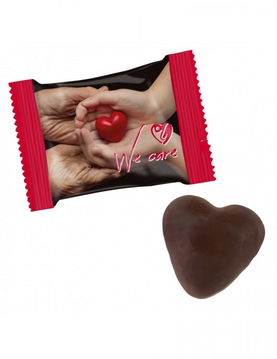 Lebkuchenherz gefüllt mit 28 % Aprikosenfruchtfüllung, umhüllt von 21 % Zartbitterschokolade, in glänzend- oder matt-kaschiertem weißem Flowpack einzeln verpackt.