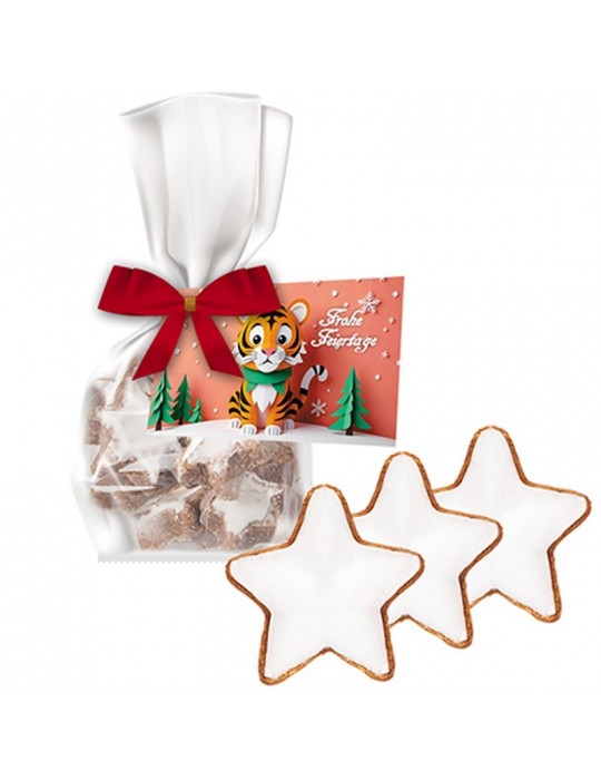 Standbeutel Mini mit Schleife aus transparenter Folie. Werbeanbringung als Werbekarte in 4c individuell bedruckbar.