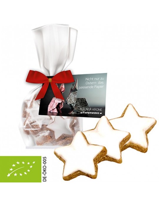 Bio Zimtsterne, ca. 50g, Express Standbeutel Mini mit Schleife mit Werbekarte