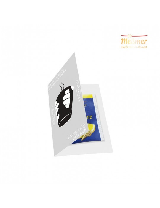 Klappkarte im DinA7 Format mit 1 Meßmer Teebeutel geklebt an der Innenseite der Karte. Die Werbung drucken wir auf allen Seiten der Klappkarte. Unter "Anhänge" können Sie alle Teesorten herunterladen. Beim Bestellvorgang, geben Sie unter "Kommentare" die gewünschte bzw. gewünschten Tessorte/n ein.