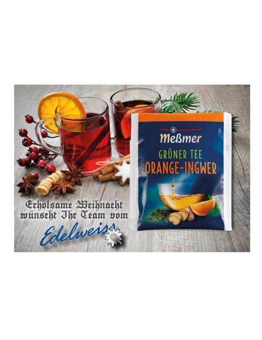 Individuell, beidseitig bedruckte Karte im DinA6 Format versehen mit 1 Meßmer Teebeutel Ihrer Wahl. Unter "Anhänge" können Sie alle Teesorten herunterladen. Beim Bestellvorgang, geben Sie unter "Kommentare" die gewünschte bzw. gewünschten Tessorte/n ein.