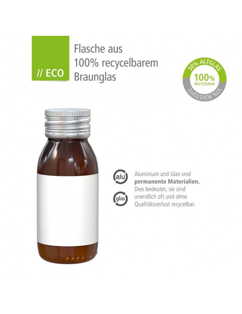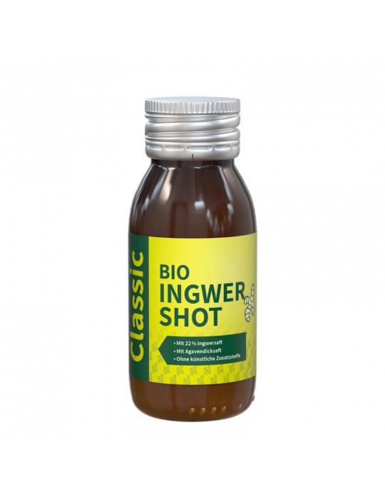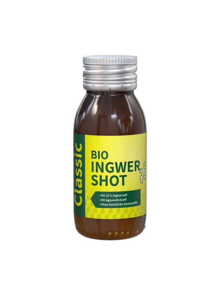 Der Bio Ingwer-Shot wird ganz nach traditionell überlieferter Rezeptur hergestellt: Er enthält 22% Ingwersaft, wird mit Agavendicksaft leicht gesüßt und mit frischen Zitronenzellen vollmundig abgerundet: • Mit 22% Ingwersaft • Mit Agavendicksaft und Zitronenzellen • Zutaten aus kontrolliert biologischem Anbau • ohne Konservierungsstoffe oder künstliche Zusätze • Perfekt portioniert mit 60 ml • Pfandfrei in nachhaltiger Verpackung Ingwer ist seit Jahrtausenden in vielen Kulturen als Superfood hoch geschätzt: Reich an Vitamin C, Eisen, Magnesium, Calcium und Kalium werden ihm vielerlei positive Wirkungen auf Körper und Geist zugeschrieben. 60 ml Shot mit silbernem Schraubverschluss: Die braune Glasflasche schützt den wertvollen Inhalt vor Licht und hält ihn frisch. Die Flasche wird zu rund 50% aus Altglas hergestellt und ist zu 100% recyclebar. Druck: 4c (CMYK) Body Label: Etikett auf Vorder- und Rückseite des Shots. Bio Rezeptur ohne künstliche Zusatzstoffe: Der Ingwer-Shot enthält 22% Saft, ist vegan, frei von Konservierungsstoffen, gluten- und laktosefrei. Er enthält keine künstlichen Farbstoffe, Aromen, Süßungsmittel oder Allergene gem. Verordnung (EU) Nr. 1169/2011. BIO Kontrollstelle DE-ÖKO-037 Füllung: 60ml