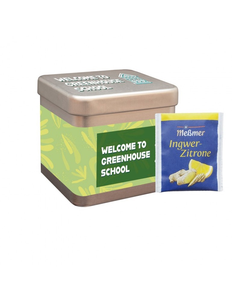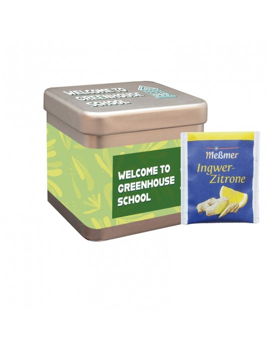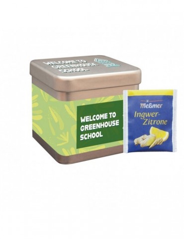 Silbermatte quadratische Dose veredelt mit Ihrer Werbung auf dem Dosendeckel, Dosenkorpus oder beides. Befüllt wird diese kompakte Dose mit Tee-Beuteln der Marke Meßmer. Der Vorteil bei dieser Füllung ist, dass man die Dose zu jeder Jahreszeit einsetzen kann.