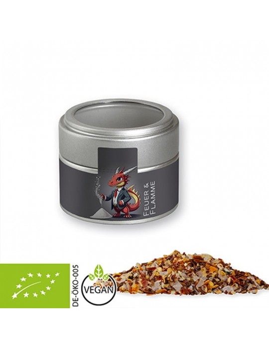 Bio Gewürzmischung Feuer und Flamme, ca. 60g, Metalldose Mini mit Sichtfenster silber