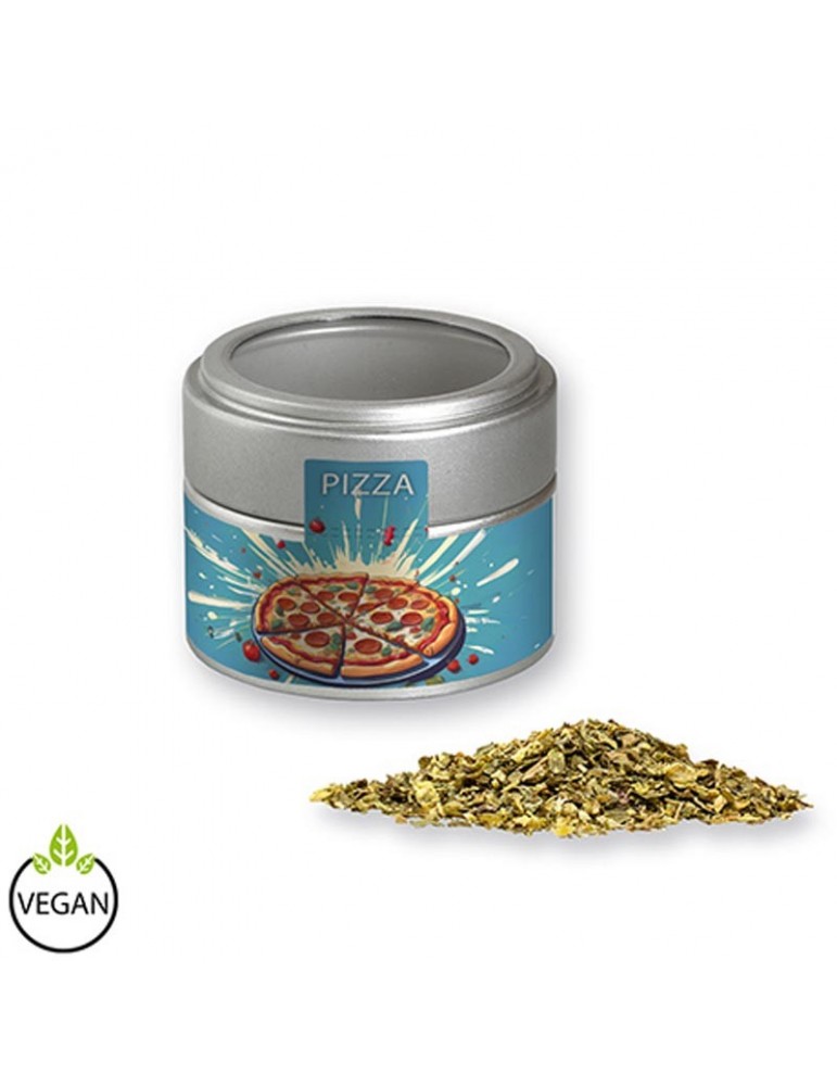 Metalldose Mini mit Sichtfenster silber. Werbeanbringung als Etikett in 4c individuell bedruckbar. Zutaten Gewürzmischung Pizza-Kräuter: Oregano, Basilikum, Knoblauch, Zwiebeln, Pfeffer.