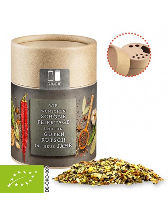 Kraftpapierstreuer Midi aus Papier. Werbeanbringung als Etikett in 4c individuell bedruckbar. Zutaten Bio Weihnachts Gewürzmischung Chefsache: Pfeffer*, Meersalz, Zwiebeln*, Tomaten*, Paprika, Knoblauch*, Petersilie*, Basilikum*, Rapsöl*. *aus kontrolliert biologischem Anbau.