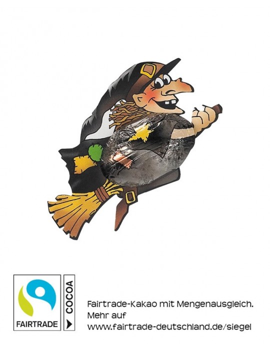 Schokoladen-Hexe in bedruckter Folie auf Karton. Fairtrade Edelvollmilchschokolade, mindestens 33% Kakao.