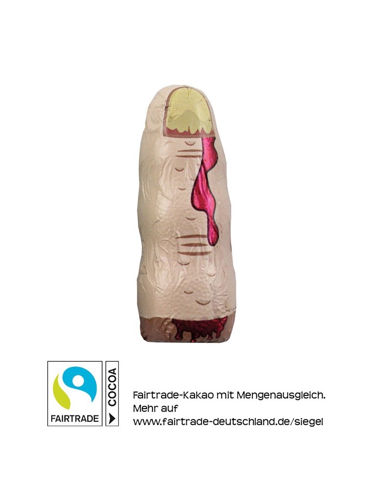 Schokoladen-Halloween Finger in bedruckter Folie. Fairtrade Edelvollmilchschokolade, mindestens 33% Kakao.