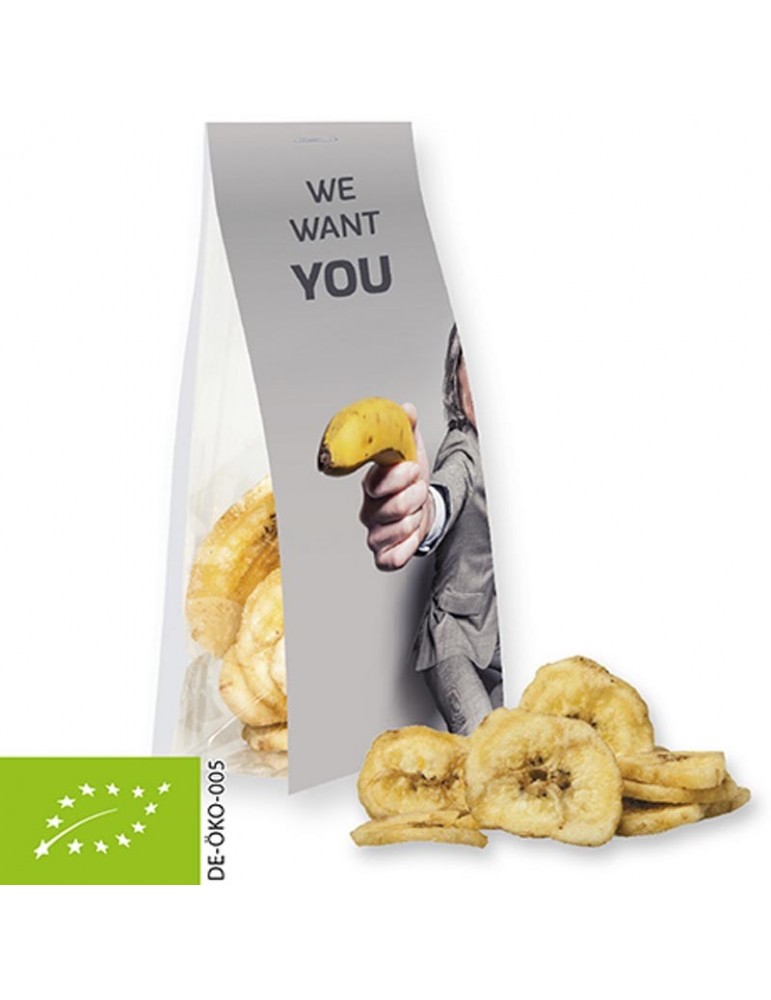 Bio Bananenchips, ca. 25g, Express Blockbodenbeutel mit Werbereiter