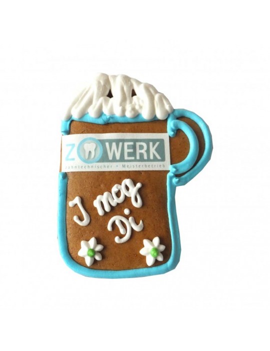 Lebkuchen-Bierkrug aus feinster Dresdner Lebkuchen, nach einem alten Hausrezept hergestellt. Mit farbigem und weißem Zuckerguss, von Hand verziert. Individualisiert mit Lebensmittelfarben auf weißer Fondantplatte oder/und per Hand mit weißem oder farbigem Zuckerguss. Verpackt in transparenter Glanzfolie.