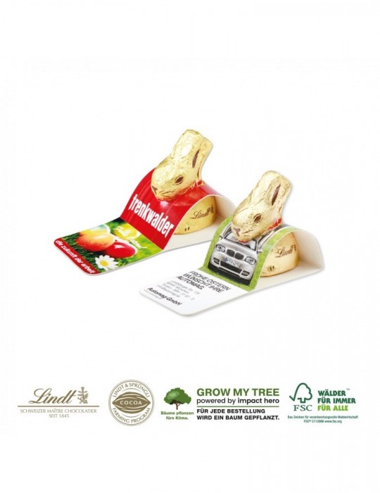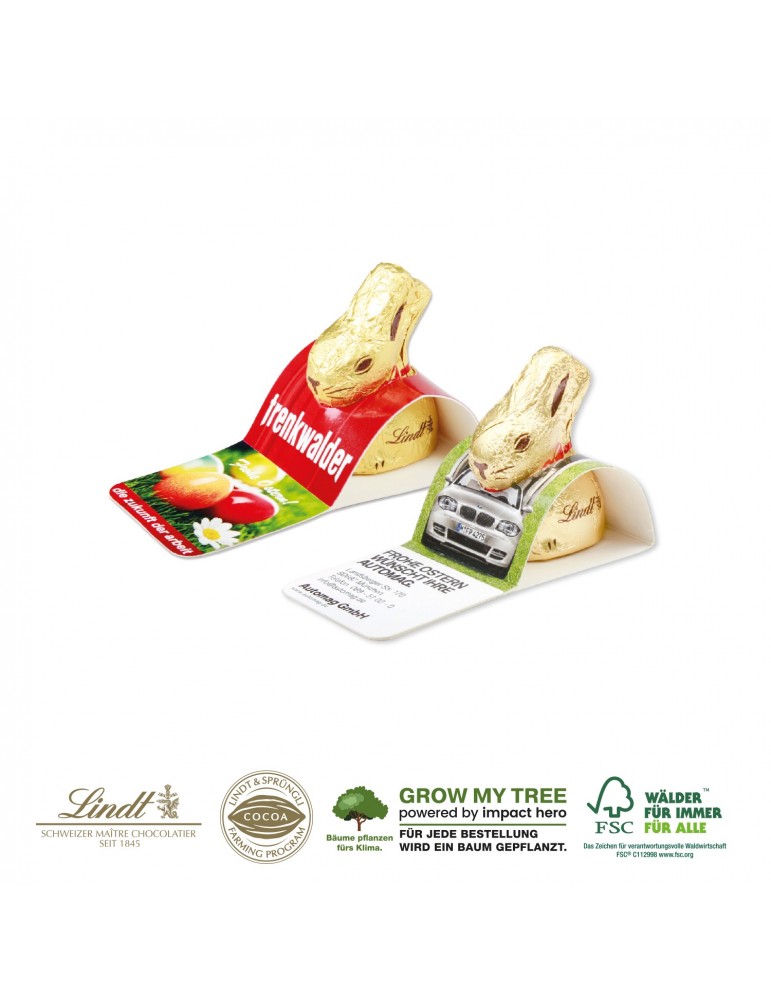 Süßer Goldhase für Ihren Werbeerfolg! Oft sind es gerade die kleinen Dinge, die uns verzaubern. Mit dem zartschmelzenden Goldhasen von Lindt ist Ihnen die Aufmerksamkeit Ihrer Kunden sicher!. Produktdetails: Original Goldhase von Lindt, im individuell bedruckten Werbeaufsteller.. Nachhaltigkeit: Für jede Bestellung mit uns wird ein Baum über GROW MY TREE gepflanzt. Wir verwenden FSC® zertifizierten Karton aus nachhaltiger Forstwirtschaft und anderen kontrollierten Quellen.