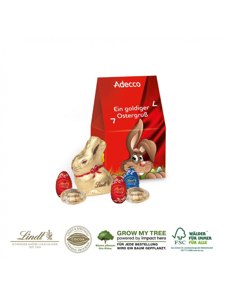 - Schokoladenmischung von Lindt (ca. 30 g) bestehend aus 4 Stück Lindt-Ostereiern bunt gemischt und einem Lindt-Goldhasen (10 g)