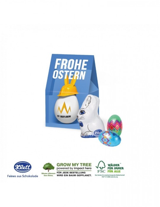 - Vollmilch Schokoladenmischung (ca. 25 g), bestehend aus 2 Stück Schokoladen-Eiern, bunt gemischt und einem Osterhasen von Klett.