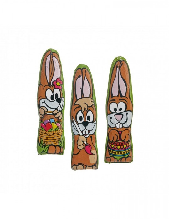 MINI-Schoki-Osterhäschen flachliegend, einzeln in Alufolie mit Standardmotiv gewickelt (Hasentrio, 3-fach bunt gemischt). Premium-Vollmilchschokolade mit mindestens 35 % Kakao