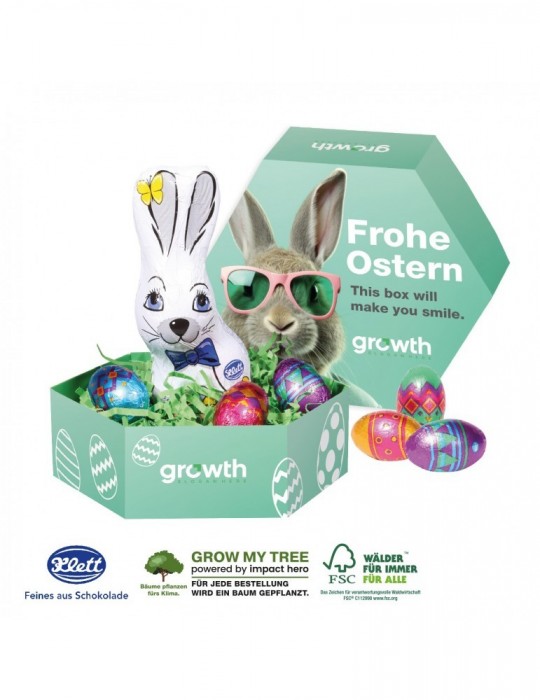 Oster-Highlight für Kunden und Mitarbeiter! Das Osternest mit leckeren Vollmilch Schokoladeneiern und einem feinen 40 g Osterhasen ist individuell bedruckbar. Liebevoll von Hand gefertigt und mit Ostergras dekoriert entsteht ein wunderbares Osterpräsent.. Produktdetails: Schokoladenmischung von Klett, in einem individuell bedruckbaren Osternest aus hochwertiger Kartonage, mit Ostergras dekoriert.. Nachhaltigkeit: Für jede Bestellung mit uns wird ein Baum über GROW MY TREE gepflanzt. Wir verwenden FSC® zertifizierten Karton aus nachhaltiger Forstwirtschaft und anderen kontrollierten Quellen.