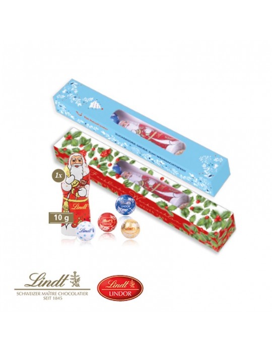 - Schokoladenmischung aus 5 Stück Lindt „Minis“ (ca. 22 g) bunt gemischt und einem zartschmelzenden Lindt Weihnachtsmann (10 g)