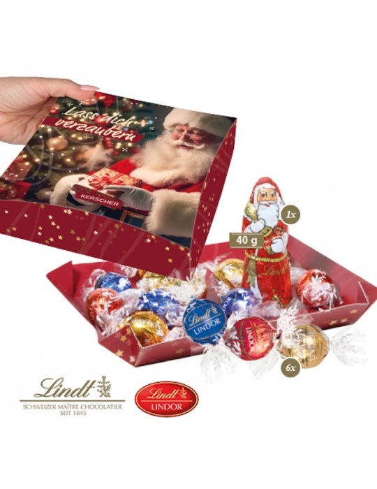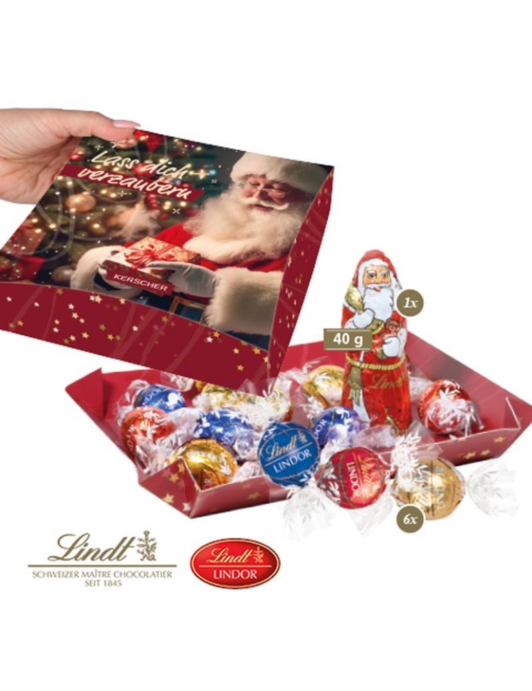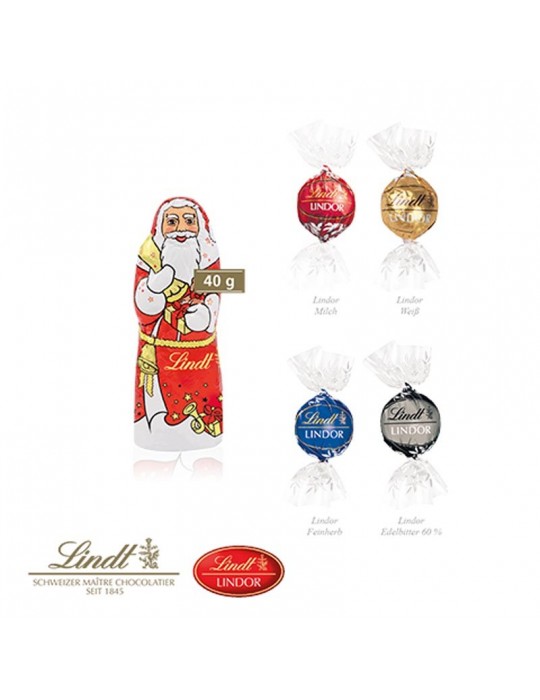 - 6 Stück (ca. 115 g) Lindor Pralinés, bunt gemischt und ein zartschmelzender Lindt Weihnachtsmann (40 g)