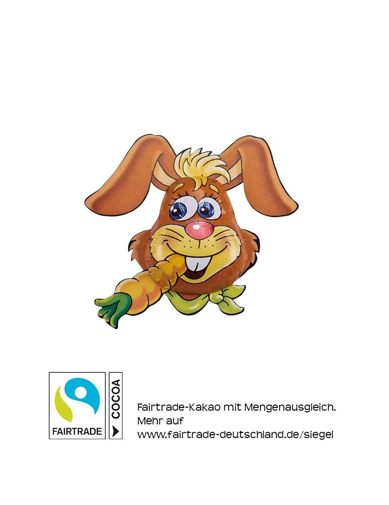 Schokoladen-Mümmel in bedruckter Folie. Fairtrade Edelvollmilchschokolade, mindestens 33% Kakao.