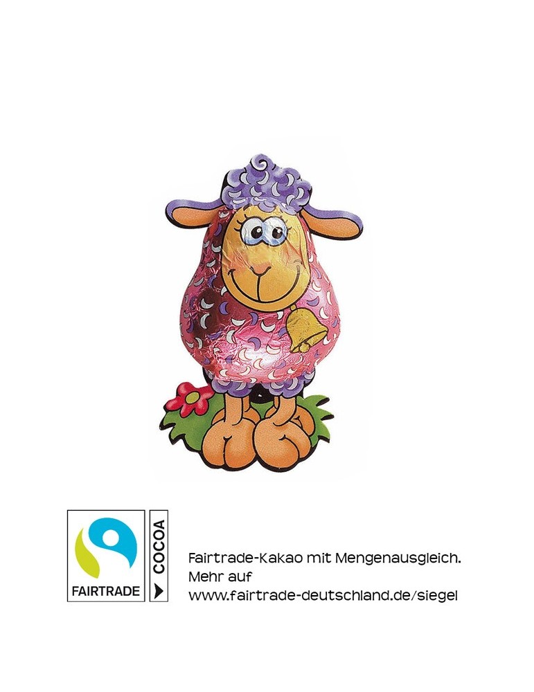 Schokoladen-Choco-Schaf in bedruckter Folie. Fairtrade Edelvollmilchschokolade, mindestens 33% Kakao.