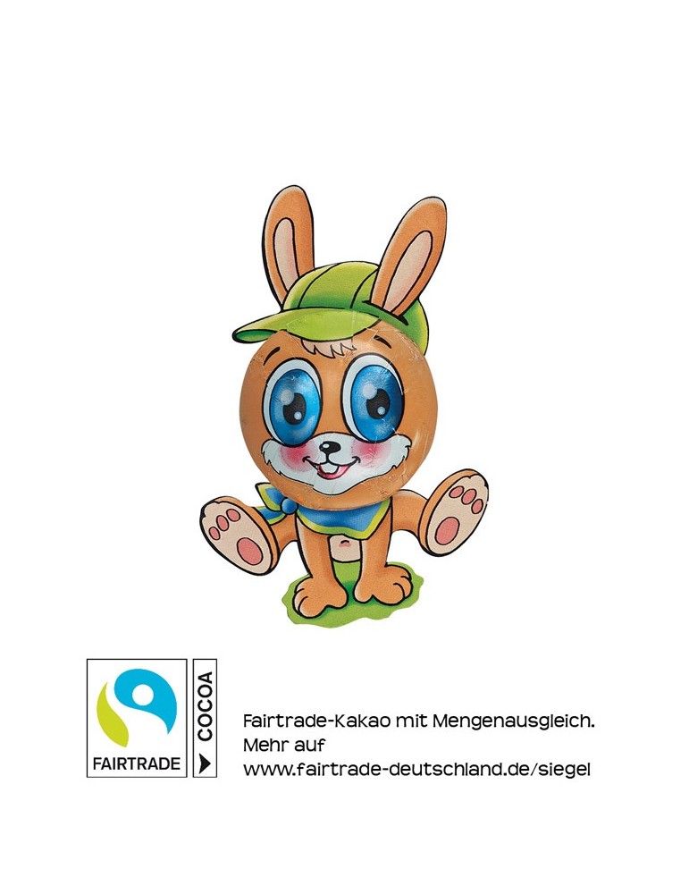 Schokoladen-Hasenjunge in bedruckter Folie. Fairtrade Edelvollmilchschokolade, mindestens 33% Kakao.