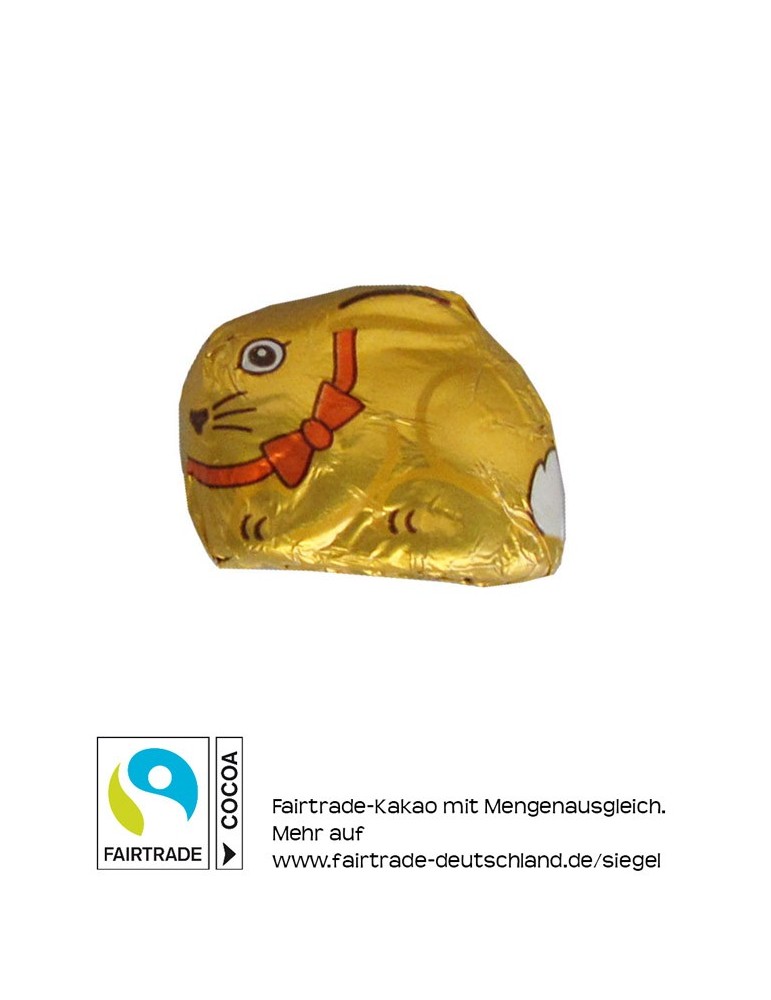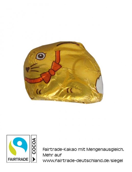 Schokoladen-Mini-Häschen in bedruckter Folie. Fairtrade Edelvollmilchschokolade, mindestens 33% Kakao.