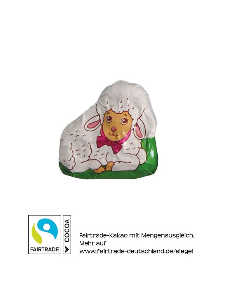 Schokoladen-Mini-Sitzlämmchen in bedruckter Folie. Fairtrade Edelvollmilchschokolade, mindestens 33% Kakao.