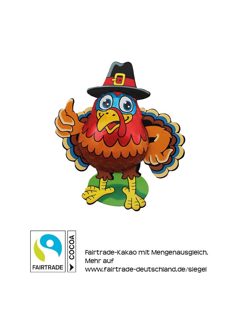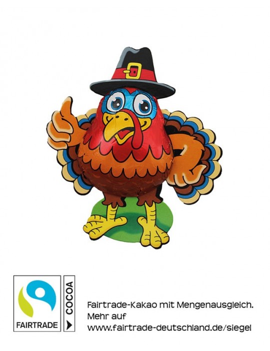 Schokoladen-Truthahn in bedruckter Folie. Fairtrade Edelvollmilchschokolade, mindestens 33% Kakao.