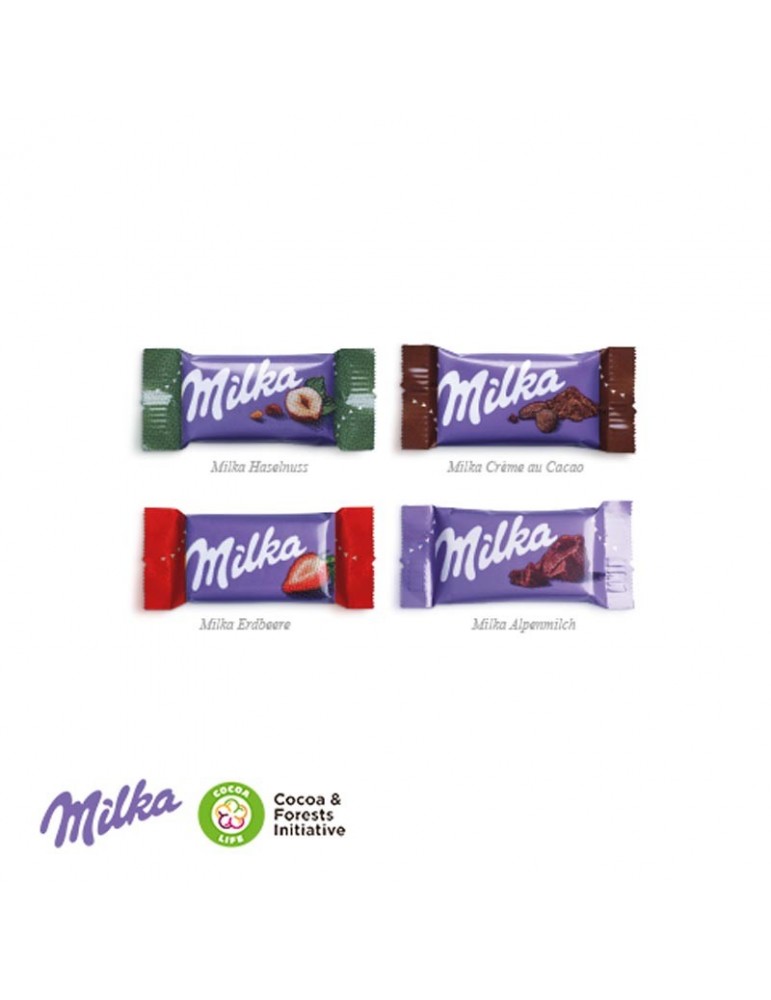 - 8 Stück (ca. 35 g) Alpenmilchschokolade von Milka. Geschmacksrichtungen: Alpenmilch, Haselnuss, Kakao und Erdbeere, bunt gemischt.
