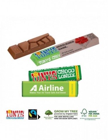 Macht die Welt ein bisschen fairer! Die faire und himmlisch leckere Tony´s Schokolade ist auch als Riegel erhältlich. Ideal als Snack für zwischendurch oder für unterwegs.. Produktdetails: Tony´s Schokolade verpackt in einem individuellen Werbeschuber.. Nachhaltigkeit: Für jede Bestellung mit uns wird ein Baum über GROW MY TREE gepflanzt. Wir verwenden FSC® zertifizierten Karton aus nachhaltiger Forstwirtschaft und anderen kontrollierten Quellen.