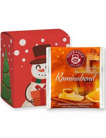 Faltschachtel. Werbeanbringung als Direktdruck in 4c individuell bedruckbar. Zutaten Beuteltee Kaminabend: Rotbusch (56%), Zimt, Orangenschalen (10%), Marzipanaroma (8%), Zichorienwurzel, Steviablätter.