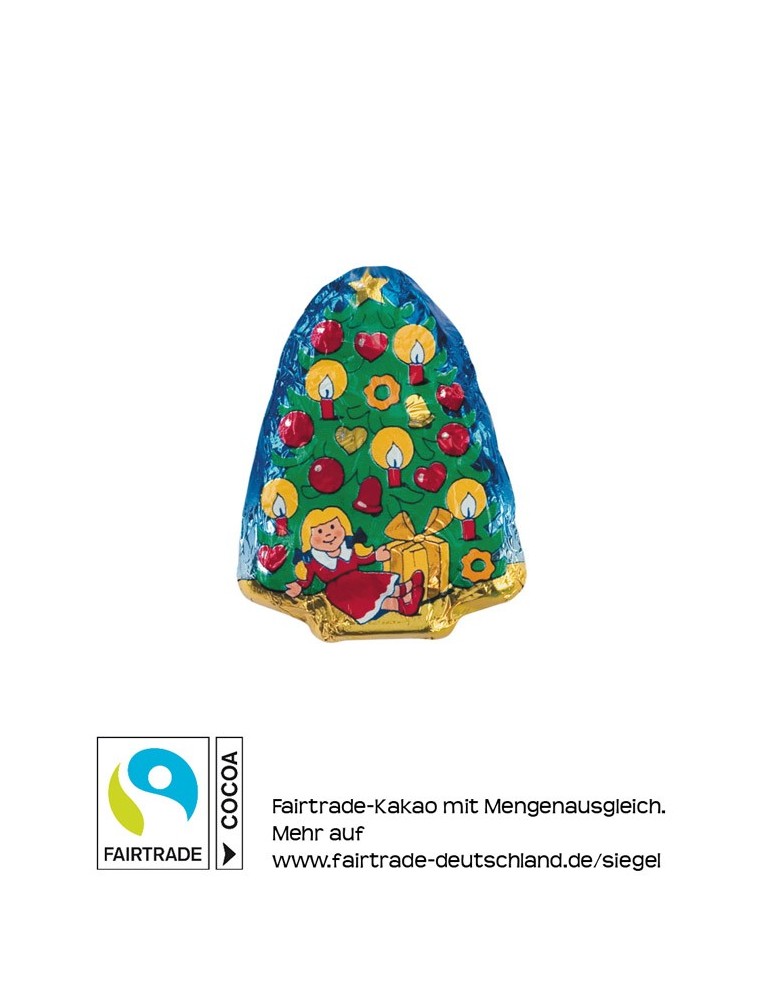 Schokoladen-Weihnachtsbäumchen in bedruckter Folie. Fairtrade Edelvollmilchschokolade, mindestens 33% Kakao.