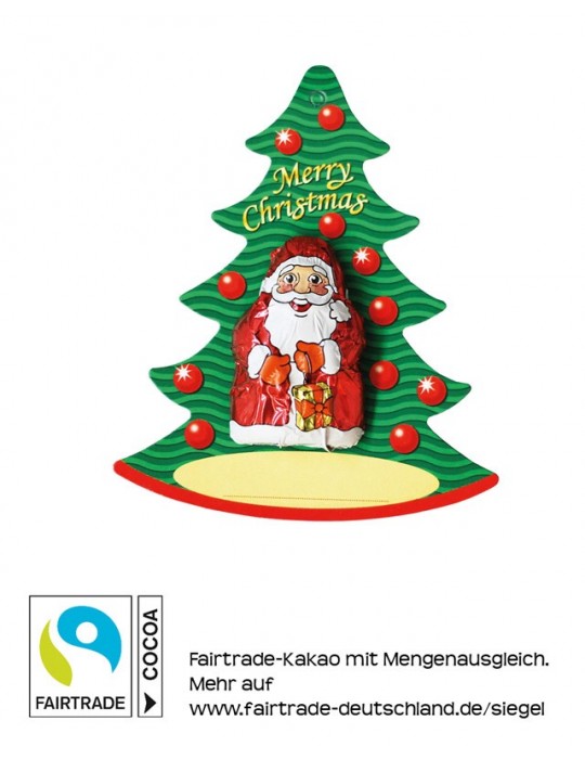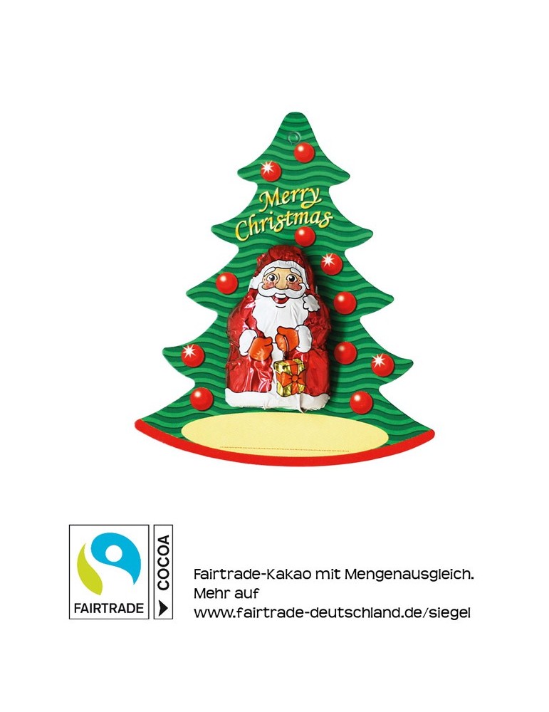 Schokoladen-Anhänger mit Santa in bedruckter Folie. Fairtrade Edelvollmilchschokolade, mindestens 33% Kakao.