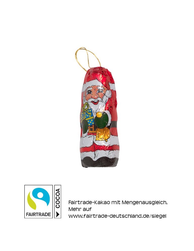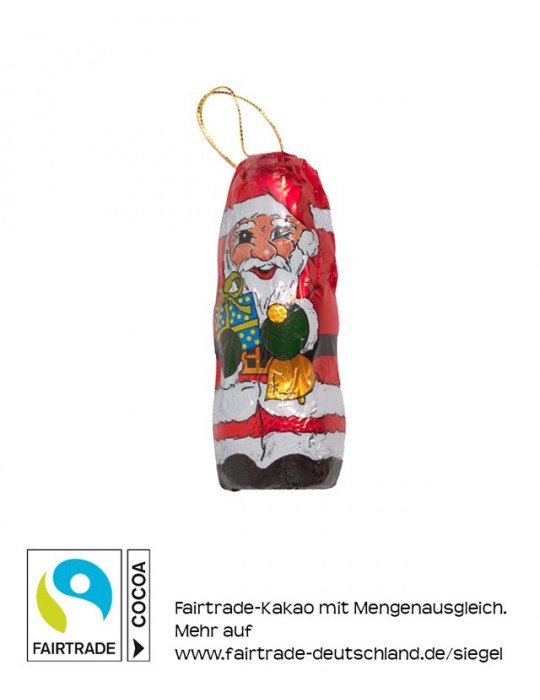 Schokoladen-Santa Claus in bedruckter Folie. Fairtrade Edelvollmilchschokolade, mindestens 33% Kakao.