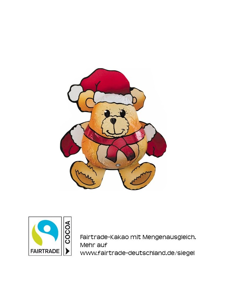 Schokoladen-Weihnachts-Bär in bedruckter Folie. Fairtrade Edelvollmilchschokolade, mindestens 33% Kakao.