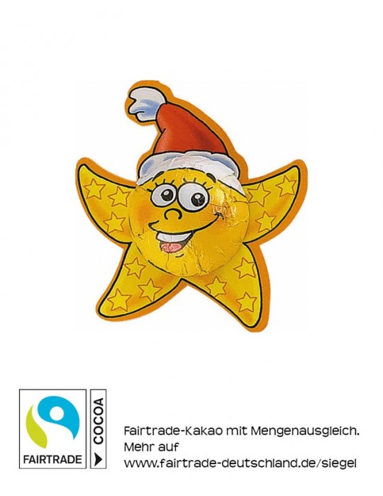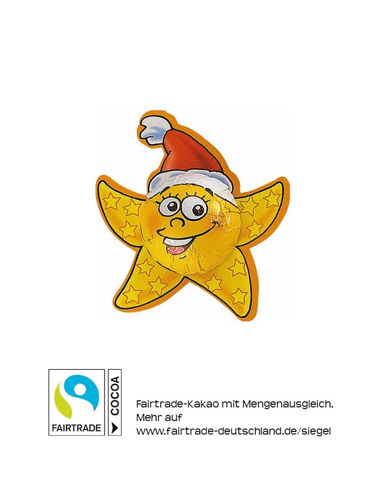 Schokoladen-Sternmännchen in bedruckter Folie. Fairtrade Edelvollmilchschokolade, mindestens 33% Kakao.